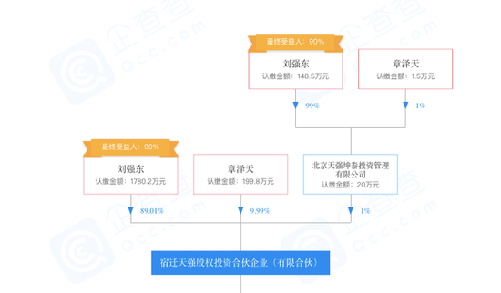 另一家天强股权投资则为夫妻二人共同发起的股权资产管理公司,股权图谱显示,天强股权投资成立于2015年9月,刘强东、章泽天持有全部股份,前者持股90%,后者则持有10%的股份。